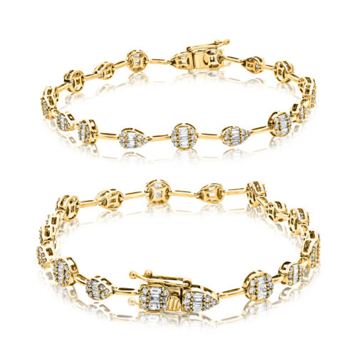 14KT YELLOW GOLD TENNIS BRACELET. 3D MULTI LINK MULTI SHAPE DESIGN. DIAMONDS ARE F/G COLOR, VS CLARITY. ROUND DIAMONDS ARE .66 CARATS. BAGUETTE DIAMONDS ARE .90 CARATS. 7" INCHES LONG.