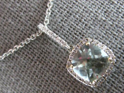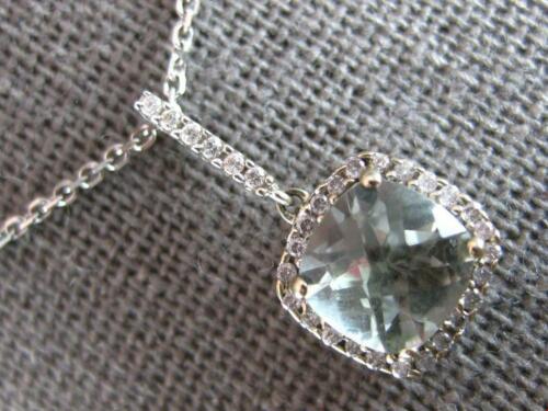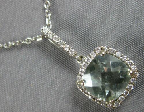 14KT WHITE GOLD FLOATING PENDANT. 3D HALO DESIGN. ROUND DIAMONDS ARE F/G COLOR, VSSI CLARITY .26 CARATS. AAA EXTRA FACETED CUSHION CUT GREEN AMETHYST IS 1.30 CARATS. GREEN AMETHYST MEASURES 8mm WIDE. PENDANT MEASURES 9mm WIDE. COMES ON A 14KT GOLD DIAMOND CUT 16" INCH CHAIN. WRITTEN APPRAISAL AVAILABLE. COMES IN A PRESENTABLE GIFT BOX.