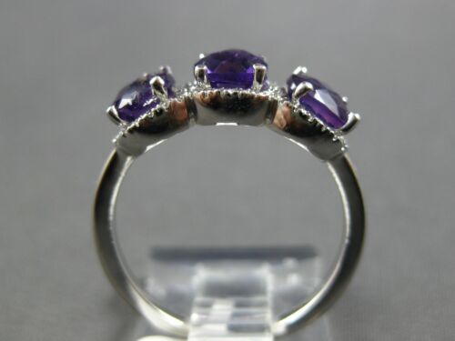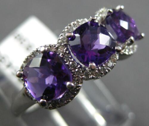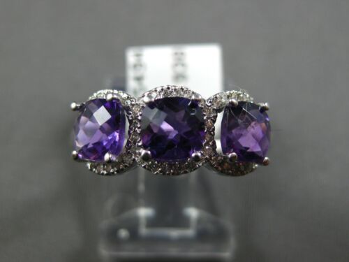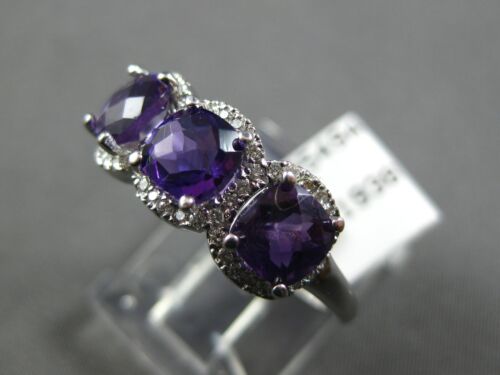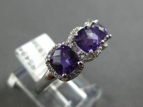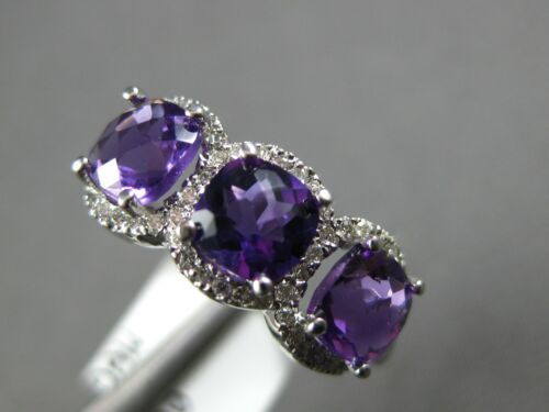 14KT WHITE GOLD RING. 3D HALO THREE STONE PAST PRESENT FUTURE DESIGN. ROUND DIAMONDS ARE F/G COLOR, VSSI CLARITY .25 CARATS. AAA EXTRA FACETED CUSHION CUT AMETHYSTS ARE 1.32 CARATS. MEASURES 7.5mm WIDE. RING SIZE 7. CAN BE SIZED BY OUR MASTER JEWELER UPON REQUEST. WRITTEN APPRAISAL AVAILABLE. COMES IN A PRESENTABLE GIFT BOX.