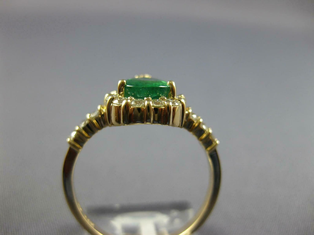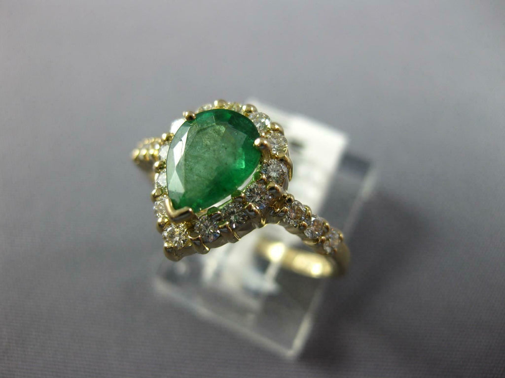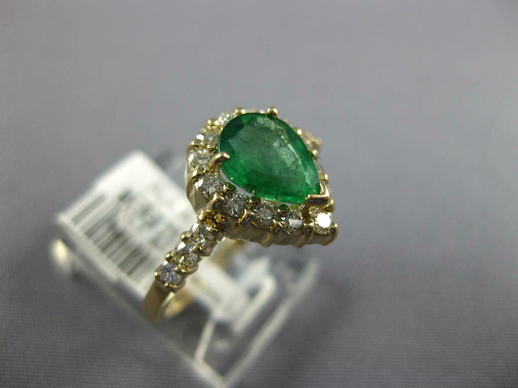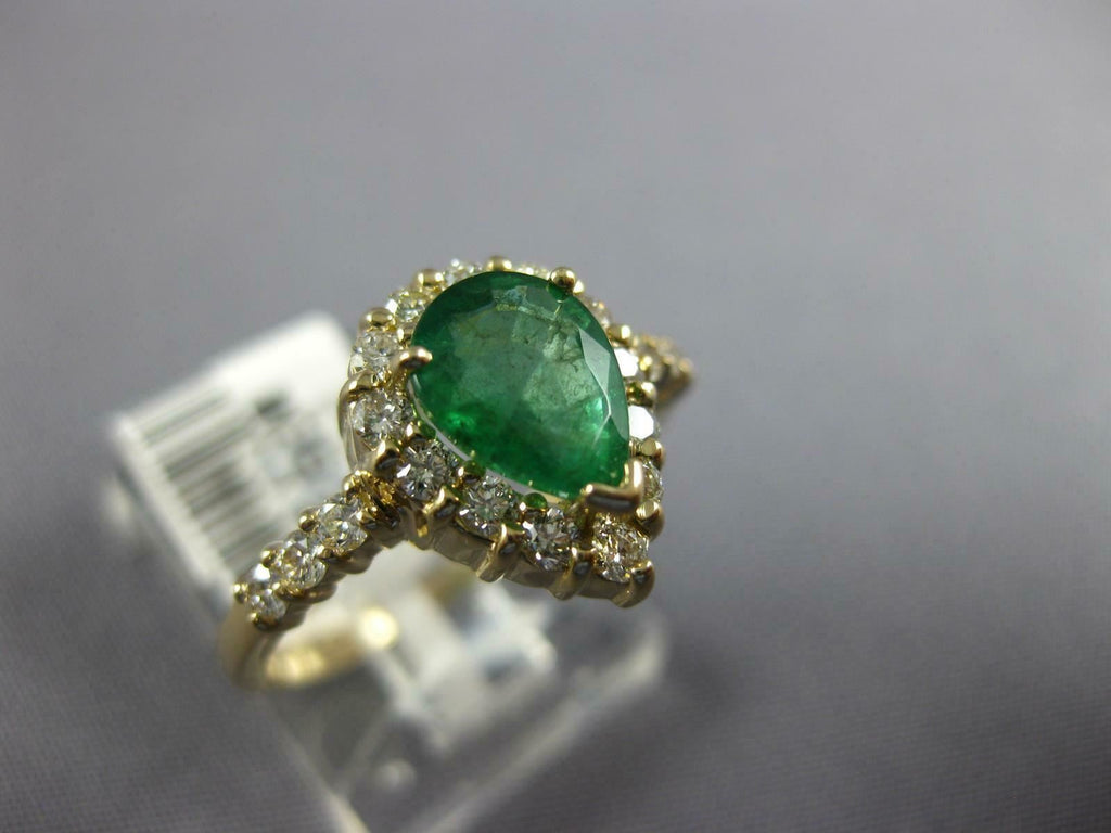 14KT YELLOW GOLD ENGAGEMENT RING. 3D CLASSIC HALO DESIGN. DIAMONDS ARE F/G COLOR, VSSI CLARITY .45 CARATS. AAA PEAR SHAPE EMERALD IS 1.12 CARATS. MEASURES 12mm X 10mm. RING SIZE 7. CAN BE SIZED BY OUR MASTER JEWELER UPON REQUEST. WRITTEN APPRAISAL AVAILABLE. COMES IN A PRESENTABLE GIFT BOX.