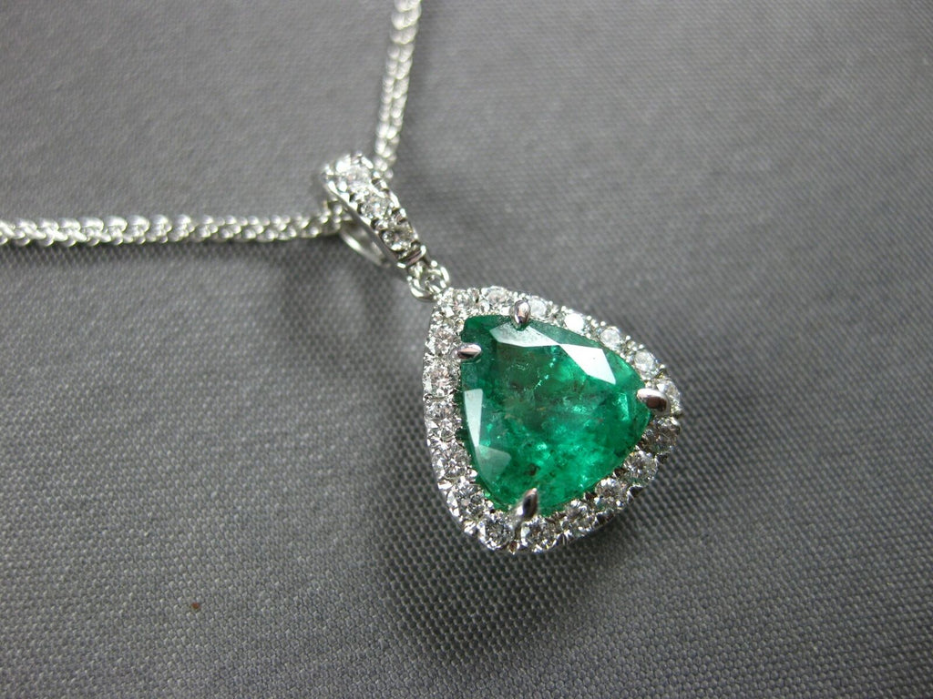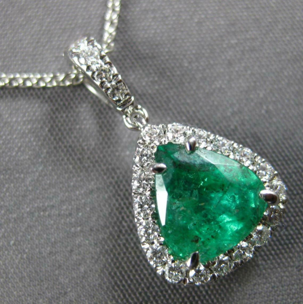 14KT WHITE GOLD FLOATING PENDANT. 3D CLASSIC HALO DESIGN. ROUND DIAMONDS ARE F/G COLOR, VVS-VS CLARITY .22 CARATS. AAA TRILLION CUT EMERALD IS 1.36 CARATS. EMERALD MEASURES 8MM X 8MM. PENDANT MEASURES 19MM X 10MM. COMES ON A 14KT GOLD DIAMOND CUT 16" INCH CHAIN. WRITTEN APPRAISAL AVAILABLE. COMES IN A PRESENTABLE GIFT BOX.