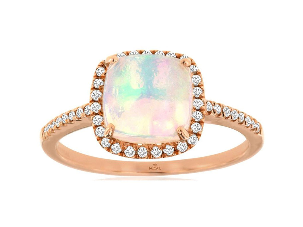 14KT ROSE GOLD FUN RING. 3D CLASSIC HALO SQUARE DESIGN. ROUND DIAMONDS ARE F/G COLOR, VSSI CLARITY .18 CARATS. AAA CUSHION CUT OPAL IS 1.40 CARATS. RING SIZE 7. CAN BE SIZED BY OUR MASTER JEWELER UPON REQUEST. WRITTEN APPRAISAL AVAILABLE. COMES IN A PRESENTABLE GIFT BOX.
