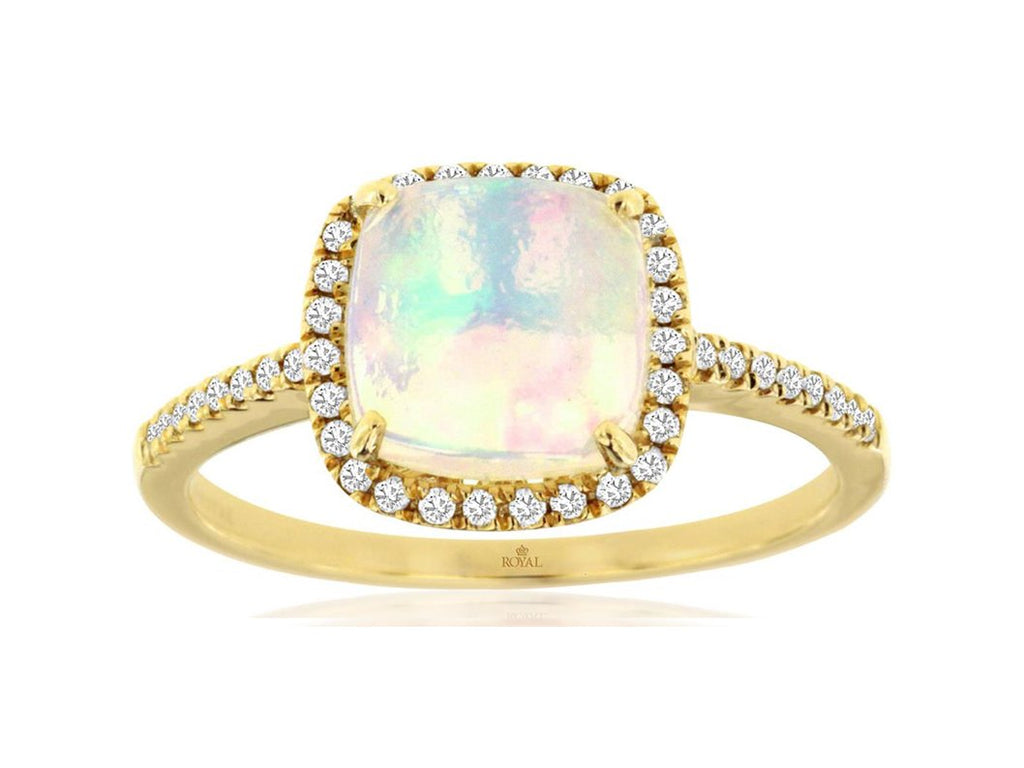 14KT YELLOW GOLD FRIENDSHIP RING. 3D CLASSIC HALO DESIGN. ROUND DIAMONDS ARE F/G COLOR, VSSI CLARITY .18 CARATS. AAA CUSHION CUT OPAL IS 1.40 CARATS. RING SIZE 7. CAN BE SIZED BY OUR MASTER JEWELER UPON REQUEST. WRITTEN APPRAISAL AVAILABLE. COMES IN A PRESENTABLE GIFT BOX.