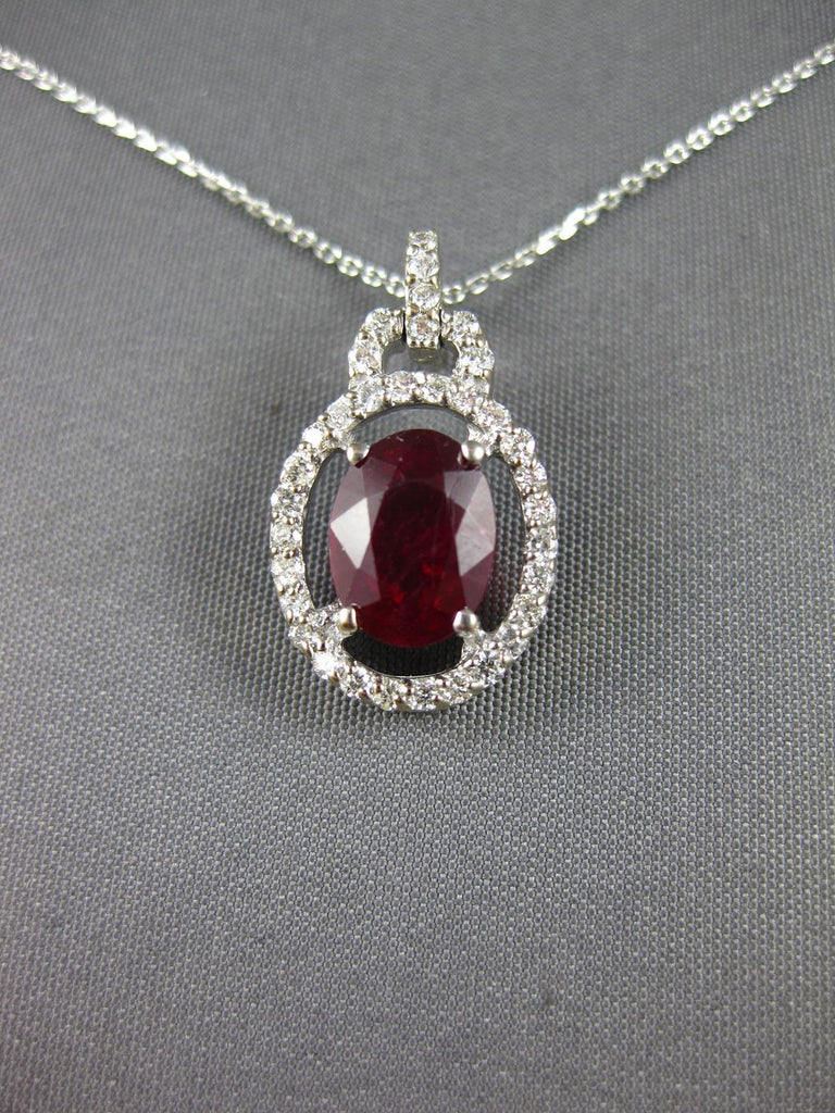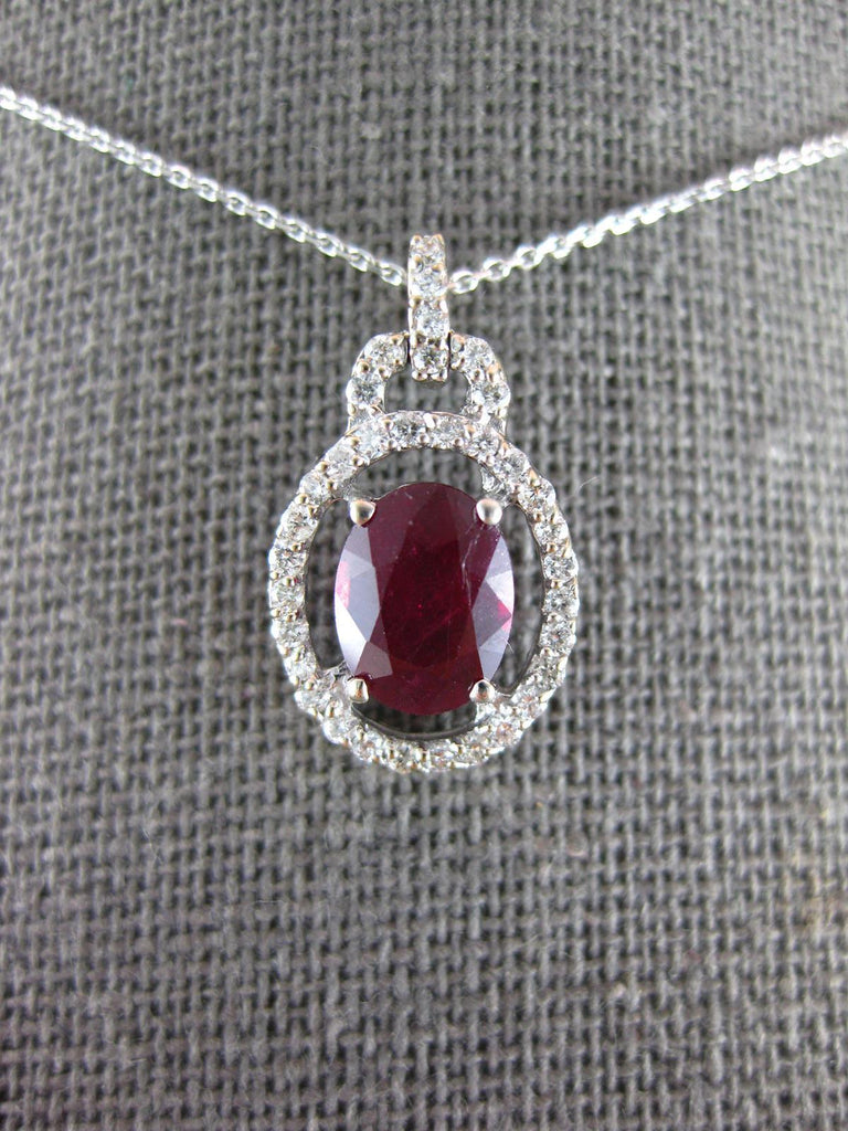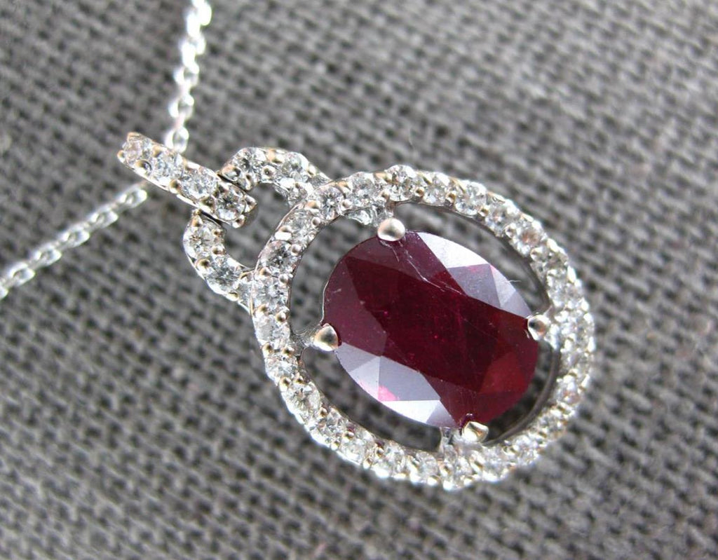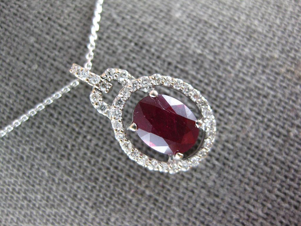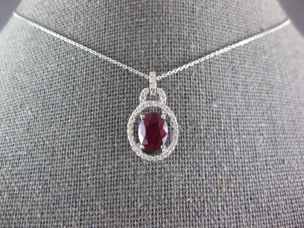 14KT WHITE GOLD FLOATING PENDANT. 3D HALO LOVE KNOT DESIGN. ROUND DIAMONDS ARE F/G COLOR, VVS CLARITY .34 CARATS. AAA OVAL RUBY IS 1.25 CARATS. RUBY MEASURES 7.7MM X 6MM. PENDANT MEASURES 19mm X 11mm. COMES ON A 14KT GOLD DIAMOND CUT 16" INCH CHAIN. WRITTEN APPRAISAL AVAILABLE. COMES IN A PRESENTABLE GIFT BOX.
