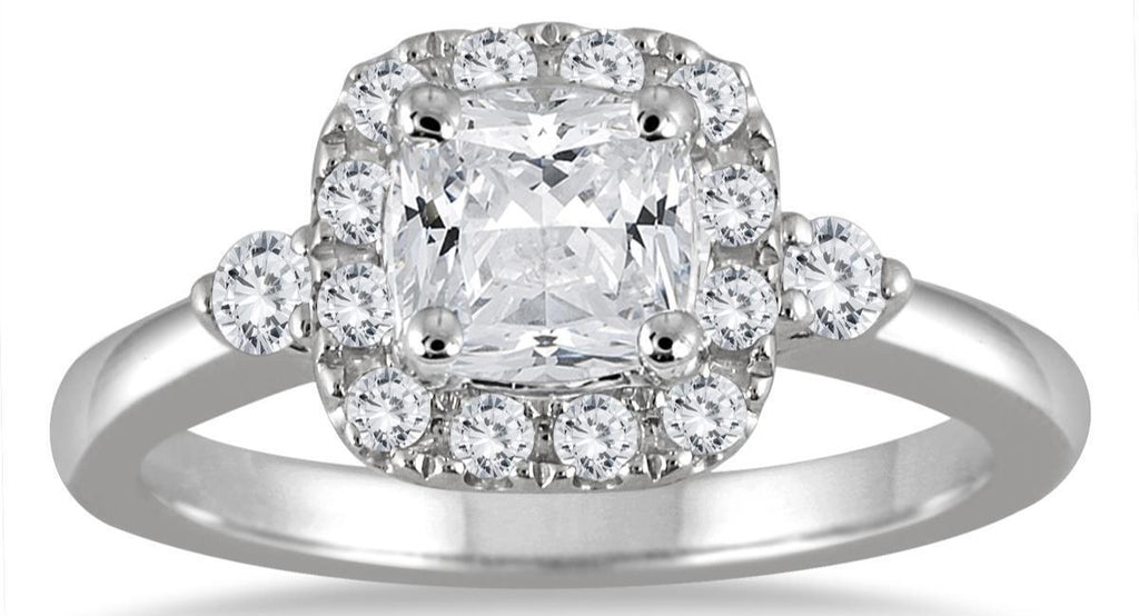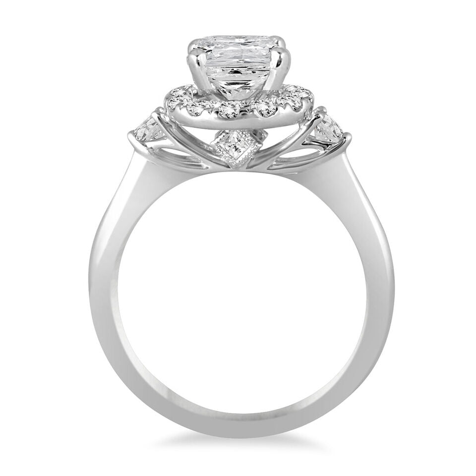 1.5CT DIAMOND 14K WHITE GOLD CUSHION & ROUND 3 STONE SQUARE HALO ENGAGEMENT RING