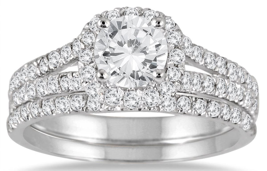 14KT WHITE GOLD ENGAGEMENT WEDDING RING SET. 3D CLASSIC HALO TRIPLE BAND DESIGN. ROUND DIAMONDS ARE G/H COLOR, SI CLARITY 1.5 CARATS. RING SIZE 6.5. CAN BE SIZED BY OUR MASTER JEWELER UPON REQUEST. WRITTEN APPRAISAL AVAILABLE. COMES IN A PRESENTABLE GIFT BOX.
