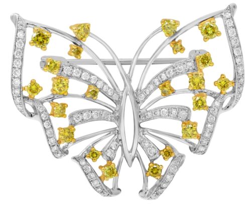14KT WHITE AND YELLOW GOLD LOVE BROOCH PIN. 3D BUTTERFLY DESIGN. WHITE DIAMONDS ARE F/G COLOR, VSSI CLARITY .60 CARATS. FANCY YELLOW DIAMONDS ARE .90 CARATS. WRITTEN APPRAISAL AVAILABLE. COMES IN A PRESENTABLE GIFT BOX.