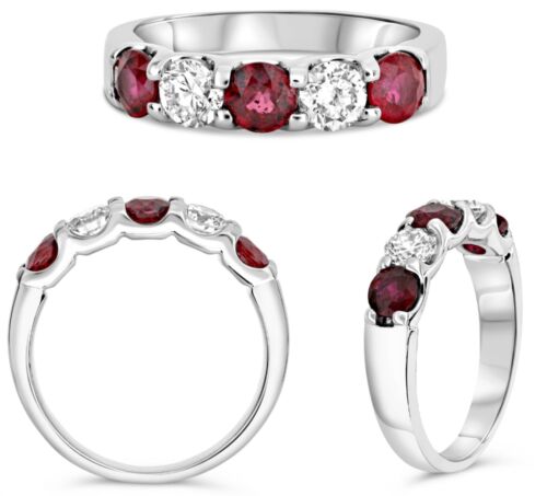14KT WHITE GOLD WEDDING ANNIVERSARY RING. 3D SHARED PRONG LUCIDA FIVE STONE DESIGN. ROUND DIAMONDS ARE F/G COLOR, VS CLARITY .50 CARATS. AAA ROUND RUBIES ARE 1.10 CARATS. RING SIZE 6.5. CAN BE SIZED BY OUR MASTER JEWELER UPON REQUEST. WRITTEN APPRAISAL AVAILABLE. COMES IN A PRESENTABLE GIFT BOX.