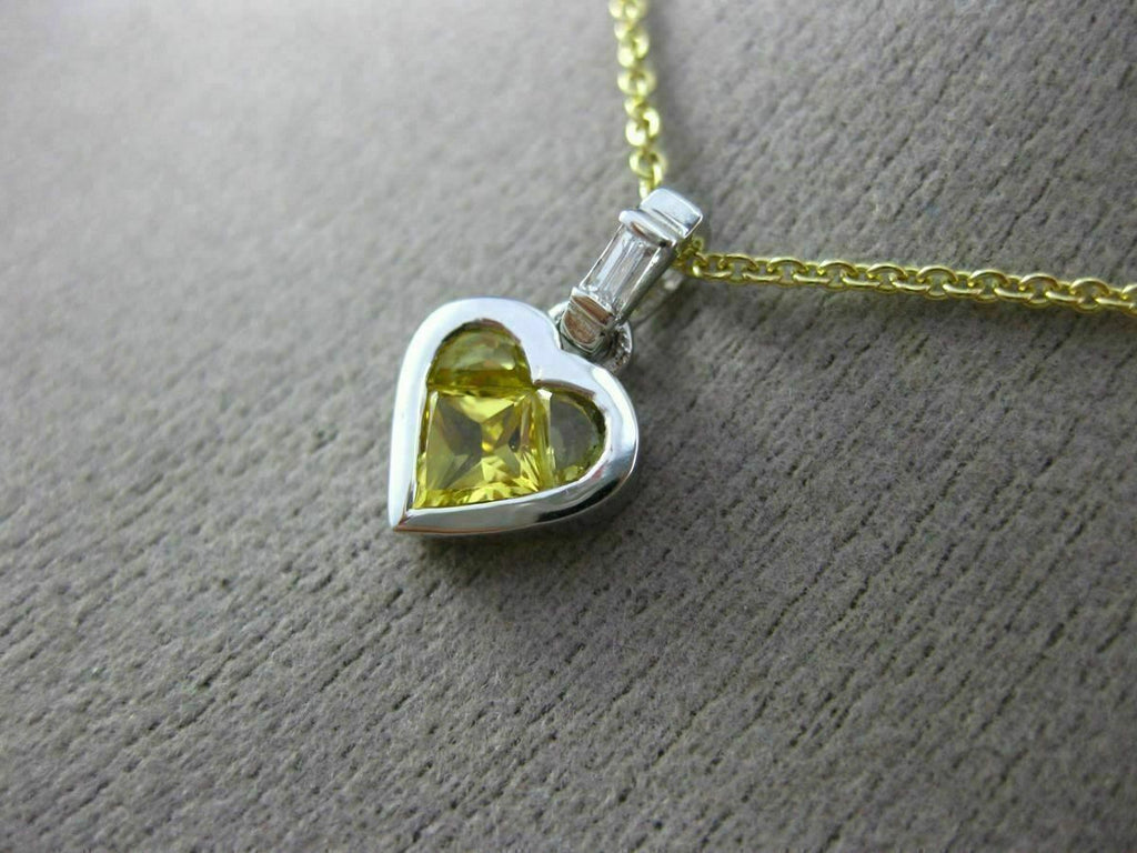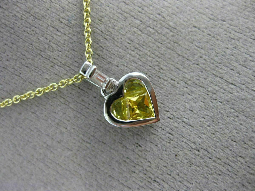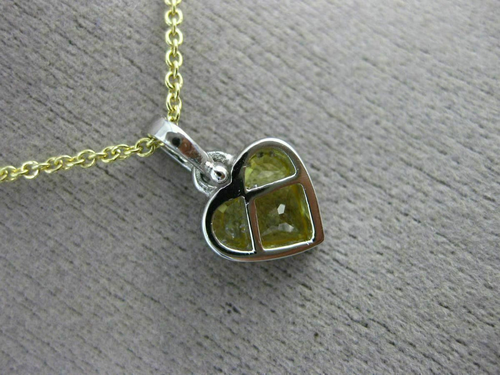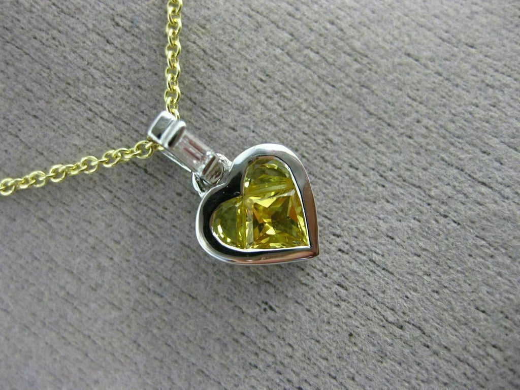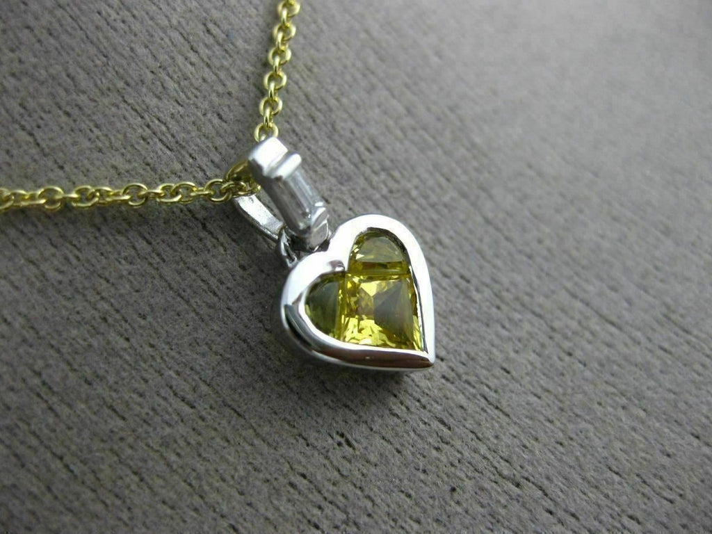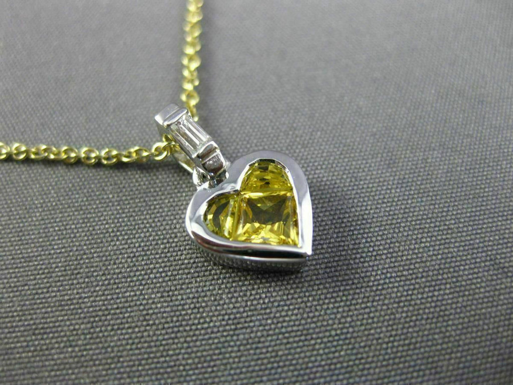 ESTATE 14KT WHITE & YELLOW GOLD LOVE PENDANT. 3D INVISIBLE HEART DESIGN. DIAMONDS ARE F/G COLOR, VS CLARITY .06 CARATS. AAA YELLOW SAPPHIRES ARE 1.54 CARATS. MEASURES 14mm X 9mm. COMES ON A 14KT GOLD DIAMOND CUT 16" INCH CHAIN. WRITTEN APPRAISAL AVAILABLE. COMES IN A PRESENTABLE GIFT BOX