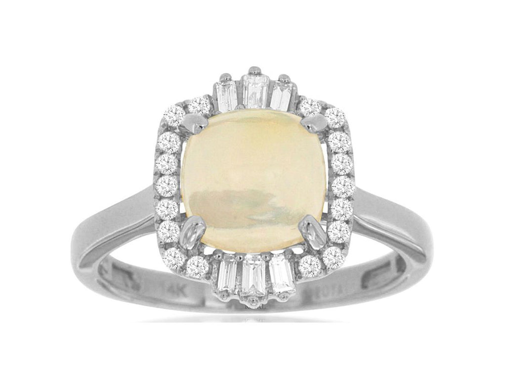 14KT WHITE GOLD FUN RING. 3D HALO SQUARE DESIGN. ROUND AND BAGUTTE DIAMONDS ARE F/G COLOR, VSSI CLARITY .21 CARATS. AAA CUSHION CUT OPAL IS 1.40 CARATS. RING SIZE 7. CAN BE SIZED BY OUR MASTER JEWELER UPON REQUEST. WRITTEN APPRAISAL AVAILABLE. COMES IN A PRESENTABLE GIFT BOX.
