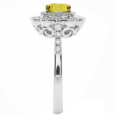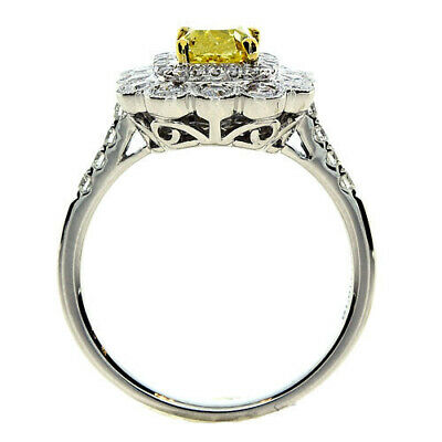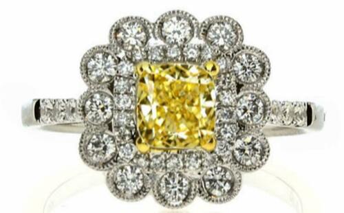 18KT WHITE AND YELLOW GOLD ENGAGEMENT RING. 3D FLOWER FILIGREE MILGRAIN DESIGN. ROUND WHITE DIAMONDS ARE F/G COLOR, VSSI CLARITY .60 CARATS. CUSHION CUT FANCY YELLOW DIAMOND IS 1.01 CARATS. RING SIZE 7. CAN BE SIZED BY OUR MASTER JEWELER UPON REQUEST. WRITTEN APPRAISAL AVAILABLE. COMES IN A PRESENTABLE GIFT BOX.