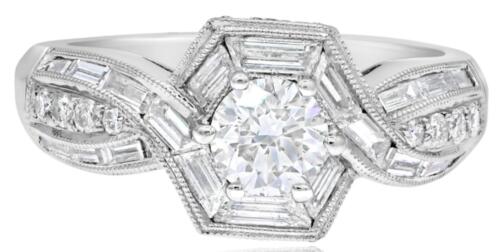 1.62CT DIAMOND 18K WHITE GOLD ROUND & BAGUETTE CRISS CROSS FILIGREE OCTAGON RING