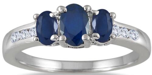 14KT WHITE GOLD FRIENDSHIP LOVE RING. 3D CLASSIC THREE STONE DESIGN. ROUND DIAMONDS ARE G/H COLOR, SI CLARITY .12 CARATS. AAA OVAL SAPPHIRES ARE 1.5 CARATS. RING SIZE 6.5. CAN BE SIZED BY OUR MASTER JEWELER UPON REQUEST.
