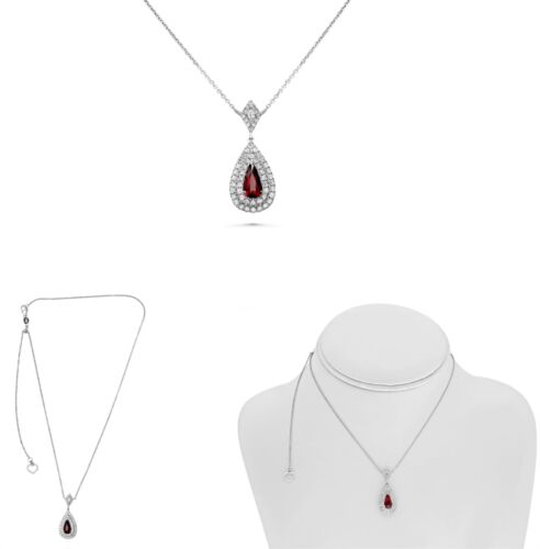 18KT WHITE GOLD LOVE NECKLACE. 3D DOUBLE HALO TEAR DROP GEOMETRICAL DESIGN. DIAMONDS ARE F/G COLOR, VS CLARITY .57 CARATS. ROUND DIAMONDS ARE .52 CARATS. KITE CUT DIAMONDS ARE .05 CARATS. AAA PEAR SHAPE RUBY IS 1.06 CARATS. 18" INCHES LONG. WRITTEN APPRAISAL AVAILABLE. COMES IN A PRESENTABLE GIFT BOX.