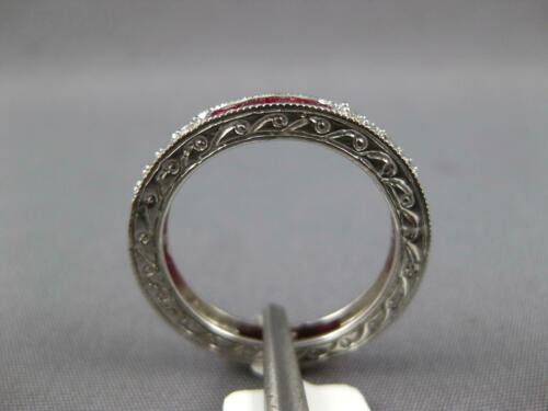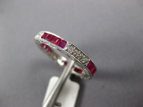 14KT WHITE GOLD ANNIVERSARY RING. 3D FILIGREE ETERNITY DESIGN. ROUND DIAMONDS ARE F/G COLOR, VSSI CLARITY .33 CARATS. AAA PRINCESS CUT RUBIES ARE 1.30 CARATS. MEASURES 2.1mm WIDE. RING SIZE 7. CAN BE SIZED BY OUR MASTER JEWELER UPON REQUEST. WRITTEN APPRAISAL AVAILABLE. COMES IN A PRESENTABLE GIFT BOX.