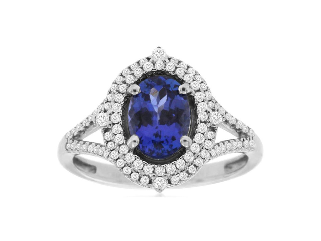 14KT WHITE GOLD CROWN RING. 3D DOUBLE HALO DESIGN. ROUND DIAMONDS ARE F/G COLOR, VSSI CLARITY .33 CARATS. AAA EXTRA FACETED OVAL TANZANITE IS 1.30 CARATS. RING SIZE 7. CAN BE SIZED BY OUR MASTER JEWELER UPON REQUEST. WRITTEN APPRAISAL AVAILABLE. COMES IN A PRESENTABLE GIFT BOX.