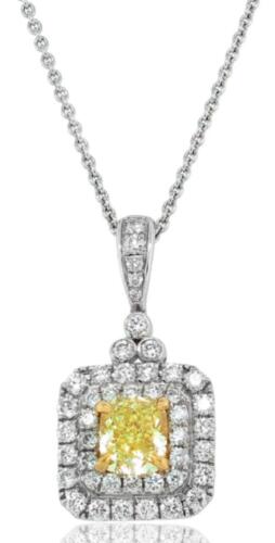 1.66CT WHITE & FANCY YELLOW DIAMOND 18K 2 TONE GOLD CUSHION & ROUND HALO PENDANT