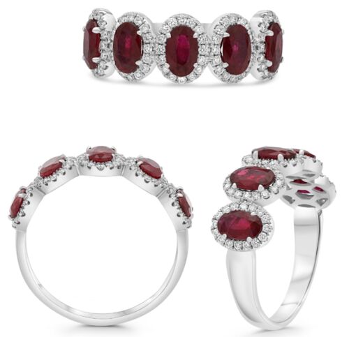 14KT WHITE GOLD ANNIVERSARY RING. 3D FIVE STONE HALO DESIGN. ROUND DIAMONDS ARE F/G COLOR, VS CLARITY .27 CARATS. AAA OVAL RUBIES ARE 1.41 CARATS. RING SIZE 6.5. CAN BE SIZED BY OUR MASTER JEWELER UPON REQUEST.