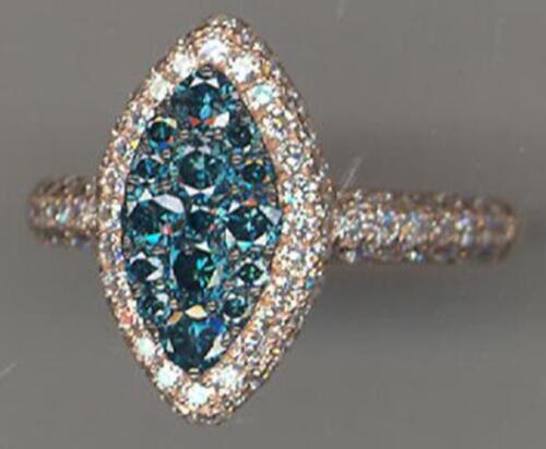 14KT ROSE GOLD FRIENDSHIP RING. 3D CLUSTER MARQUISE SHAPE DESIGN. WHITE DIAMONDS ARE F/G COLOR, VSSI CLARITY .98 CARATS. BLUE DIAMONDS ARE .70 CARATS. RING SIZE 7. CAN BE SIZED BY OUR MASTER JEWELER UPON REQUEST. WRITTEN APPRAISAL AVAILABLE. COMES IN A PRESENTABLE GIFT BOX.