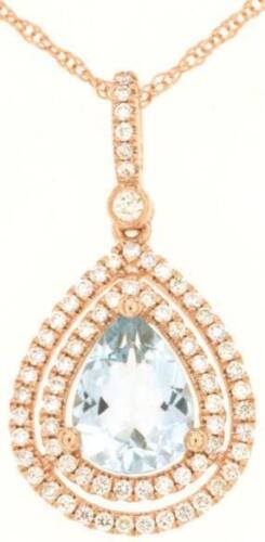14KT ROSE GOLD FUN FLOATING PENDANT. 3D DOUBLE HALO TEAR DROP DESIGN. ROUND DIAMONDS ARE F/G COLOR, VSSI CLARITY .40 CARATS. AAA EXTRA FACETED PEAR SHAPE AQUAMARINE IS 1.30 CARATS. COMES ON A 14KT GOLD DIAMOND CUT 16" INCH CHAIN. WRITTEN APPRAISAL AVAILABLE. COMES IN A PRESENTABLE GIFT BOX.