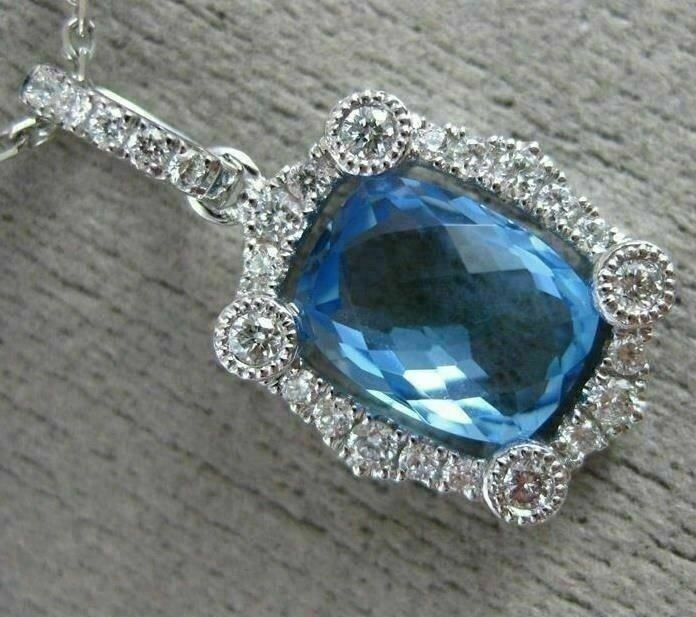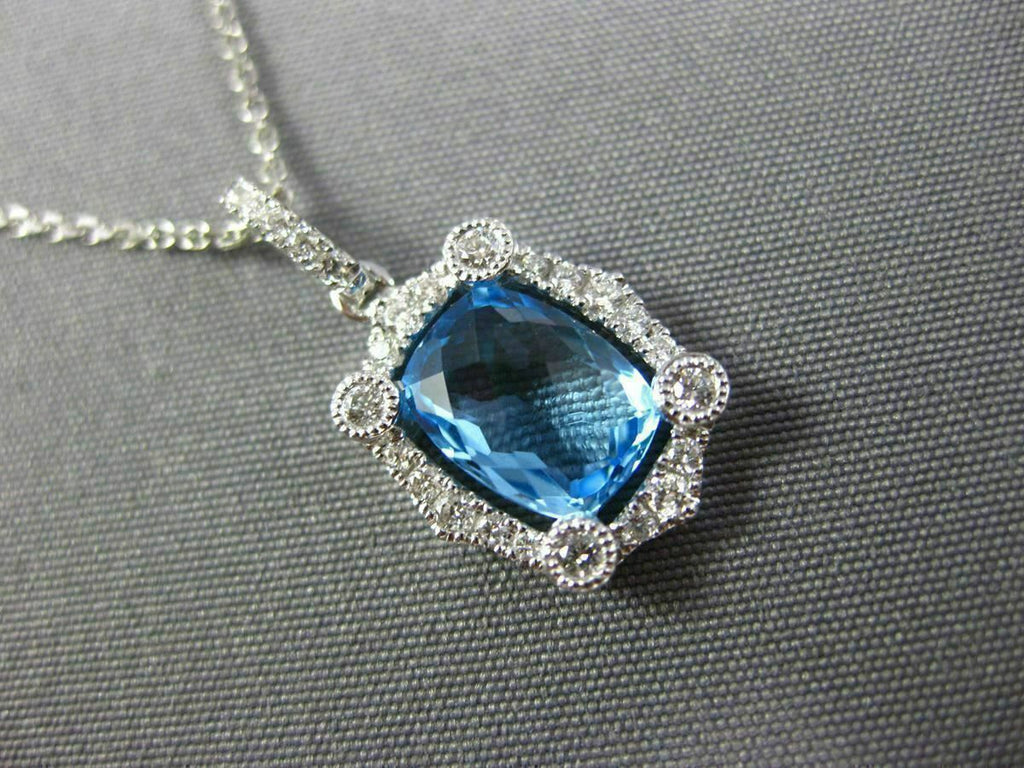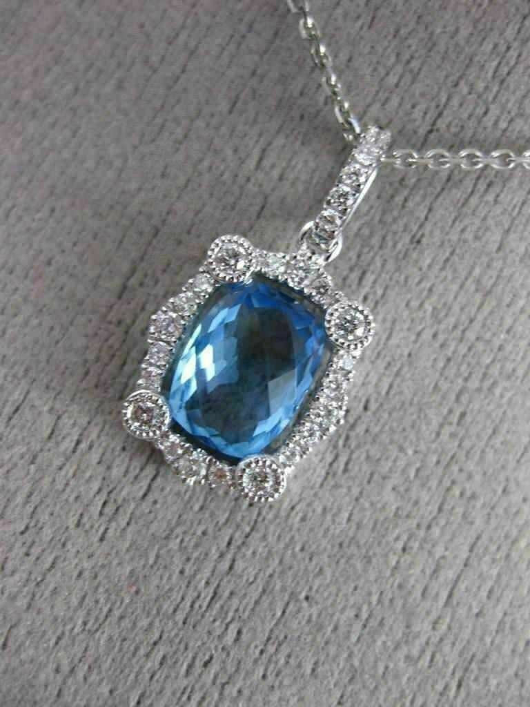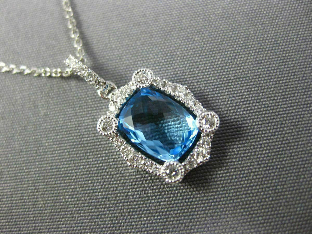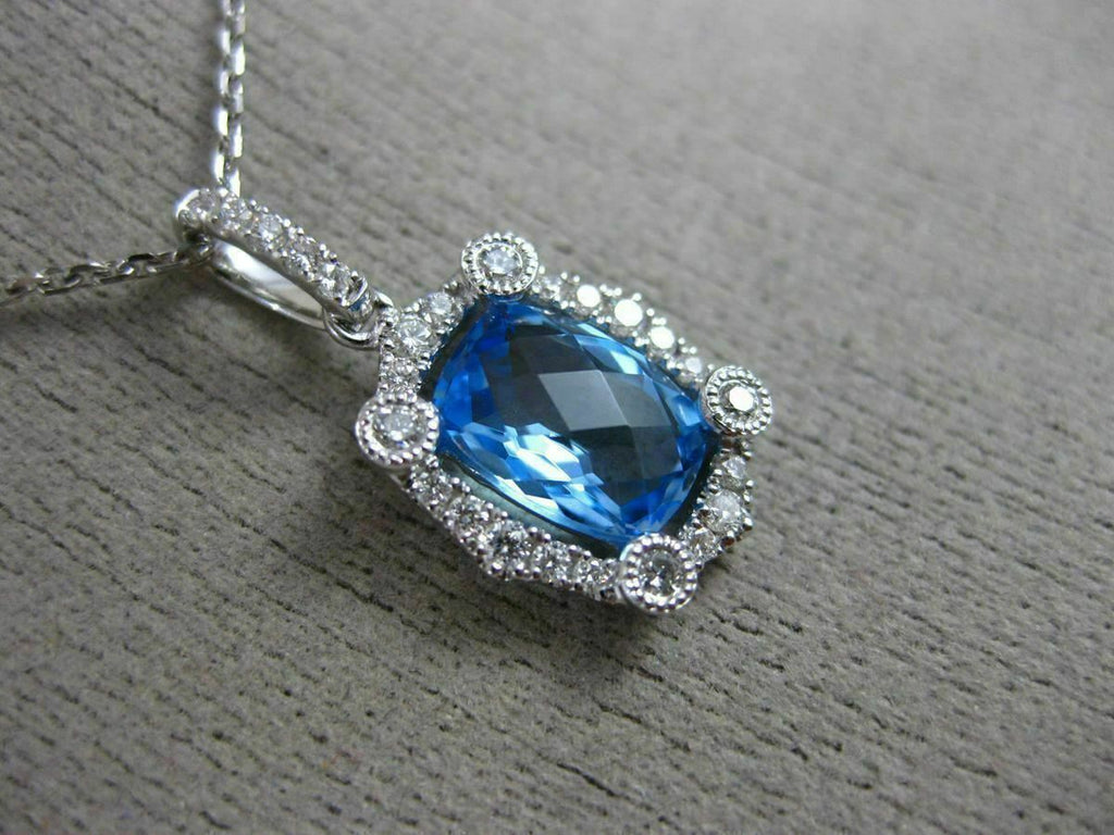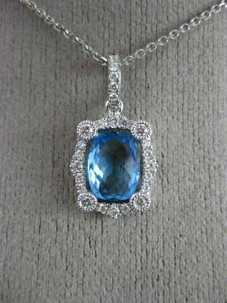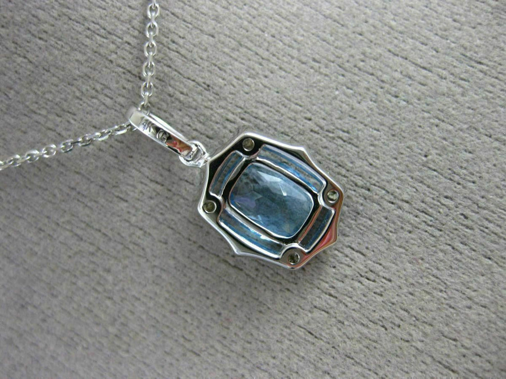 14KT WHITE GOLD FLOATING PENDANT. 3D RECTANGULAR ETOILE FILIGREE HALO DESIGN. DIAMONDS ARE F/G COLOR, VSSI CLARITY .20 CARATS. AAA EXTRA FACET BLUE TOPAZ IS 1.50 CARATS. MEASURES 20mm X 10mm. COMES ON A 14KT GOLD DIAMOND CUT 16" INCH CHAIN. WRITTEN APPRAISAL AVAILABLE. COMES IN A PRESENTABLE GIFT BOX