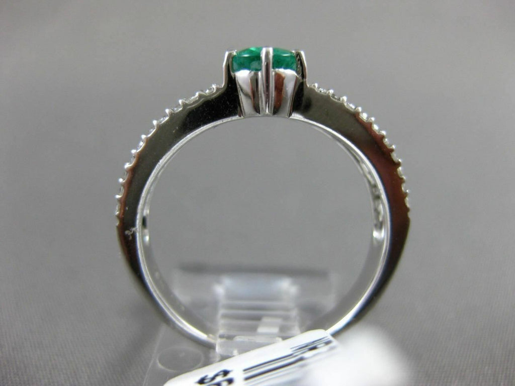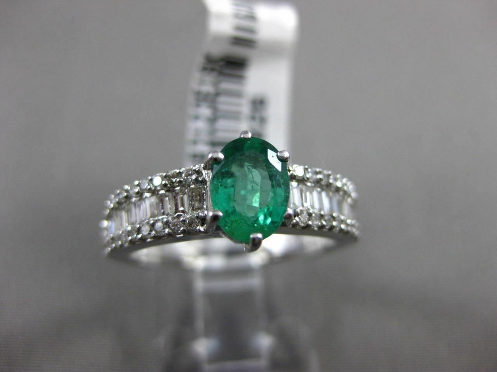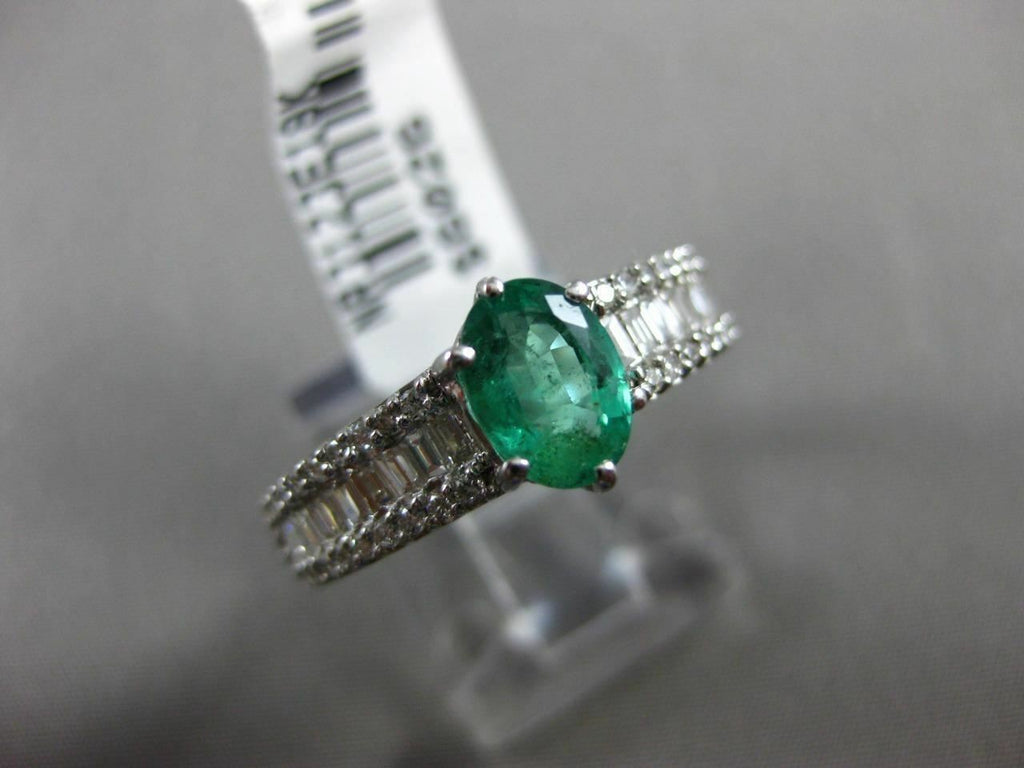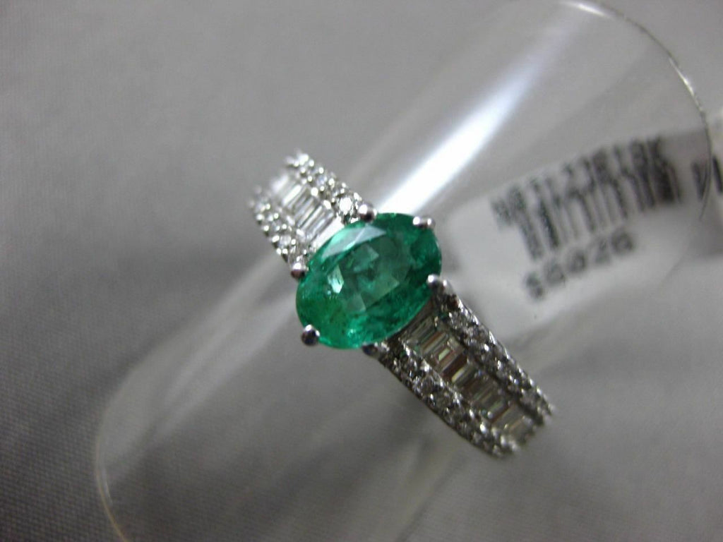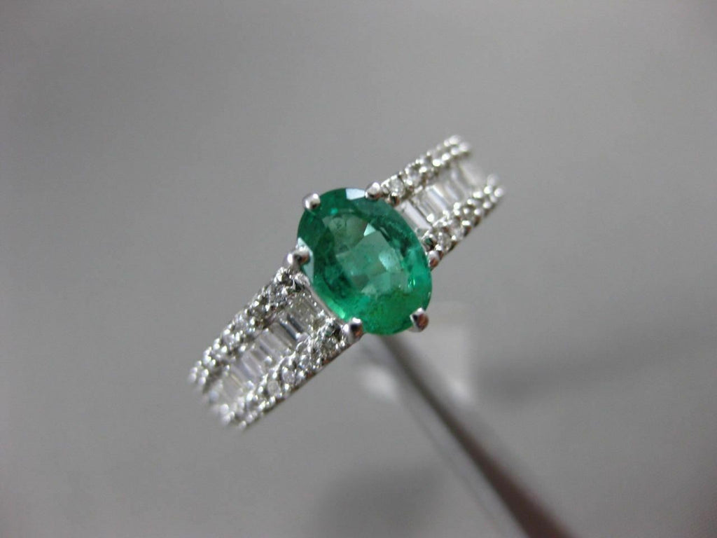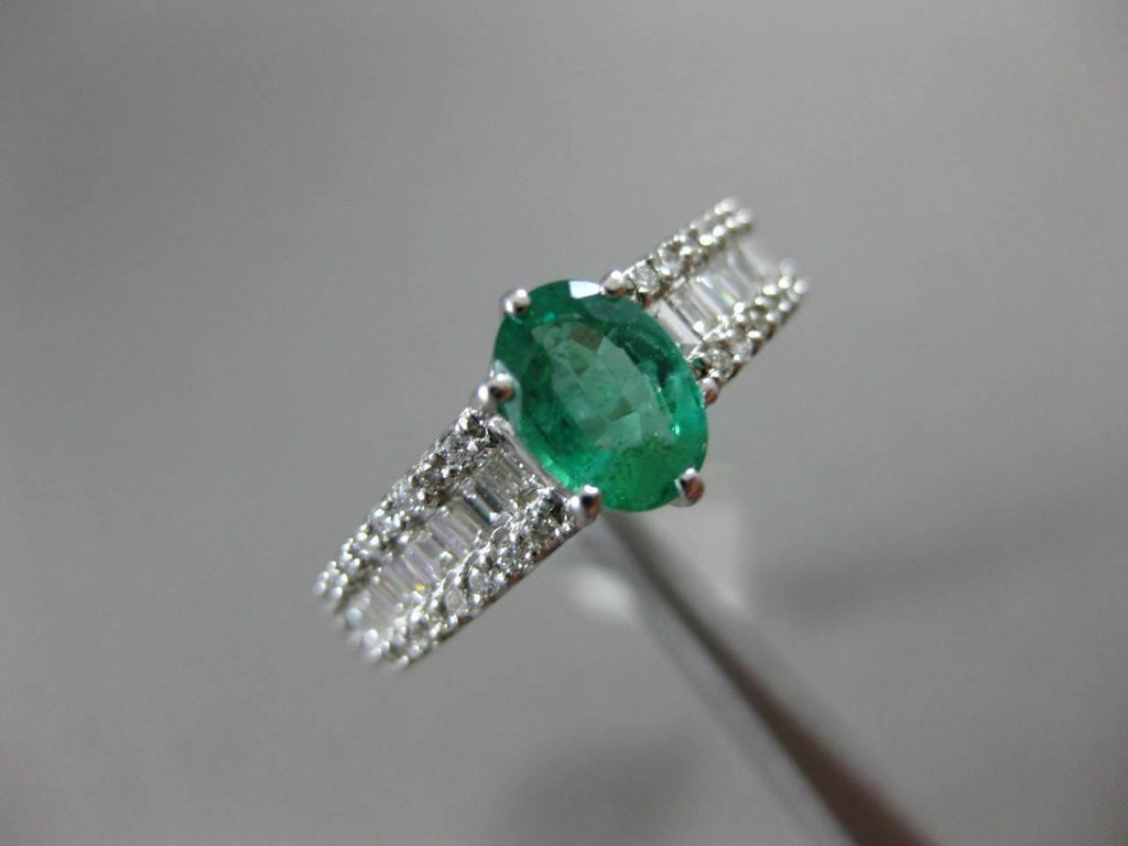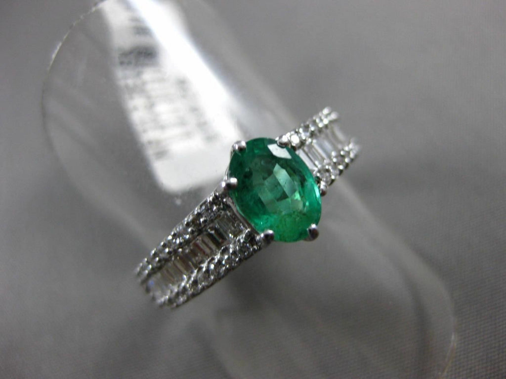 ESTATE 18KT WHITE GOLD ENGAGEMENT RING. 3D OVAL DESIGN. ROUND & BAGUETTE DIAMONDS ARE F/G COLOR, VSSI CLARITY .92 CARATS. AAA EMERALD IS .79 CARATS MEASURES 8mm WIDE. RING SIZE 7. CAN BE SIZED BY OUR MASTER JEWELER UPON REQUEST. WRITTEN APPRAISAL AVAILABLE. COMES IN A PRESENTABLE GIFT BOX.