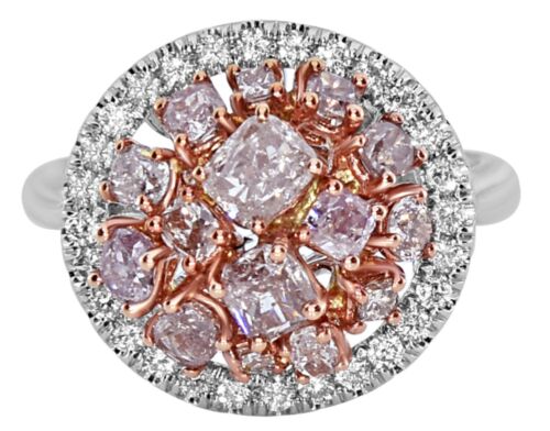 18KT WHITE AND ROSE GOLD FUN RING. 3D CLUSTER CIRCULAR DESIGN. WHITE DIAMONDS ARE F/G COLOR, VSSI CLARITY .35 CARATS. MULTI SHAPE PINK DIAMONDS ARE 1.37 CARATS. RING SIZE 7. CAN BE SIZED BY OUR MASTER JEWELER UPON REQUEST. WRITTEN APPRAISAL AVAILABLE. COMES IN A PRESENTABLE GIFT BOX.