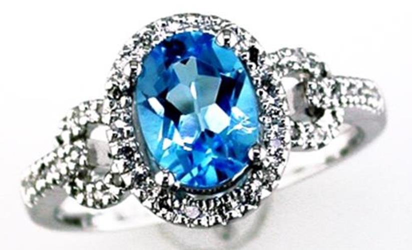 14KT WHITE GOLD FUN RING. 3D LOVE KNOT DESIGN. ROUND DIAMONDS ARE F/G COLOR, VSSI CLARITY .18 CARATS. AAA EXTRA FACETED OVAL BLUE TOPAZ IS 1.55 CARATS. RING SIZE 7. CAN BE SIZED BY OUR MASTER JEWELER UPON REQUEST. WRITTEN APPRAISAL AVAILABLE. COMES IN A PRESENTABLE GIFT BOX.