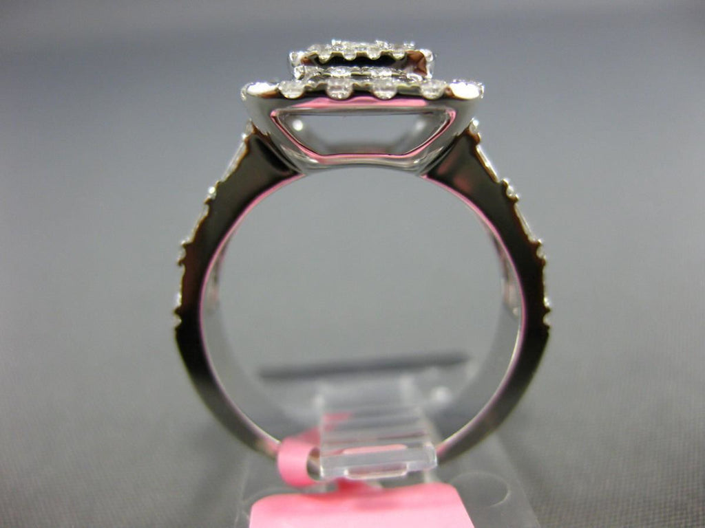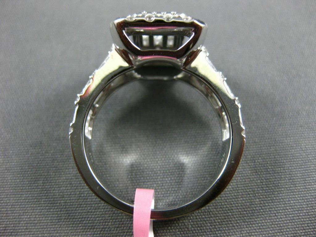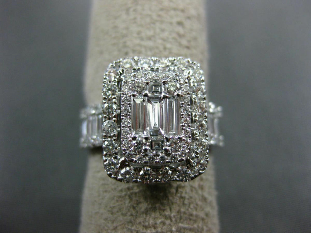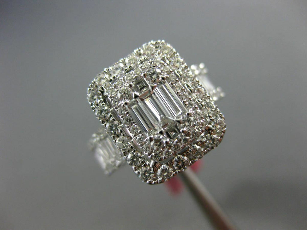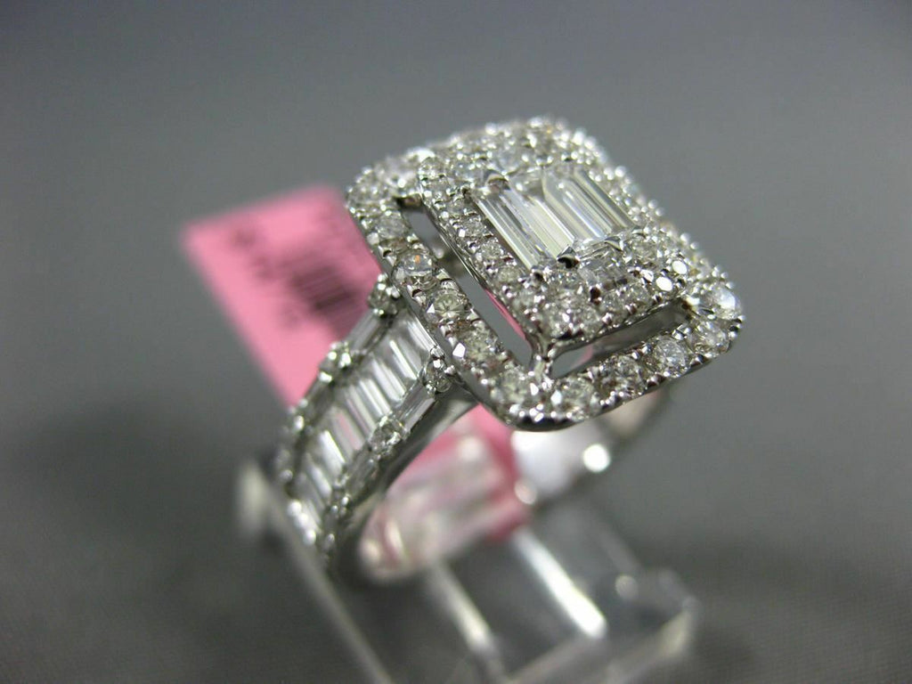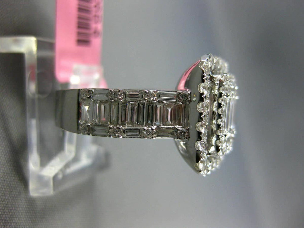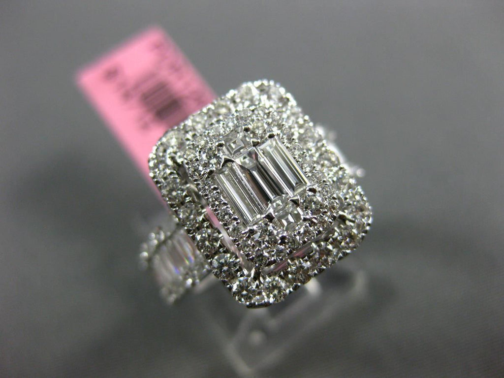 LARGE 18KT WHITE GOLD ENGAGEMENT RING. 3D SQUARE HALO SEMI ETERNITY DESIGN. ROUND & BAGUETTE DIAMONDS ARE F/G COLOR, VSSI CLARITY 1.73 CARATS. MEASURES 14mm WIDE. RING SIZE 6.50. CAN BE SIZED BY OUR MASTER JEWELER UPON REQUEST. WRITTEN APPRAISAL AVAILABLE. COMES IN A PRESENTABLE GIFT BOX.