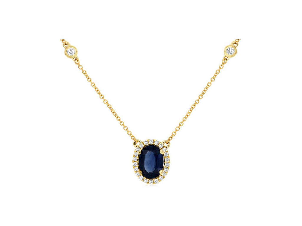 14KT YELLOW GOLD LOVE NECKLACE. 3D HALO BY THE YARD DESIGN. ROUND DIAMONDS ARE F/G COLOR, VSSI CLARITY .27 CARATS. AAA OVAL SAPPHIRE IS 1.47 CARATS. 17" INCHES LONG. WRITTEN APPRAISAL AVAILABLE. COMES IN A PRESENTABLE GIFT BOX.