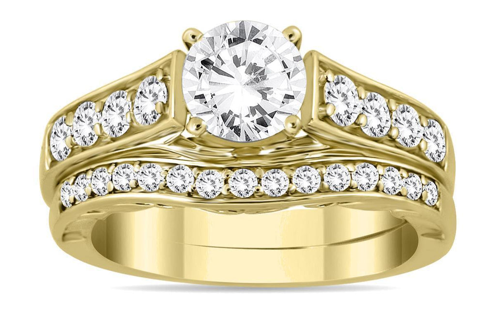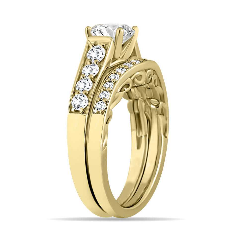 14KT YELLOW GOLD ENGAGEMENT WEDDING ANNIVERSARY RING SET. 3D SOLITAIRE GRADUATING FILIGREE DESIGN. ROUND DIAMONDS ARE G/H COLOR, SI CLARITY 1.75 CARATS. RING SIZE 6.5. CAN BE SIZED BY OUR MASTER JEWELER UPON REQUEST. WRITTEN APPRAISAL AVAILABLE. COMES IN A PRESENTABLE GIFT BOX.