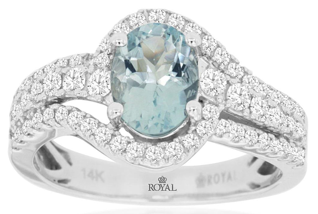 1.75CT DIAMOND & AAA AQUAMARINE 14KT WHITE GOLD OVAL & ROUND HALO SWIRL FUN RING