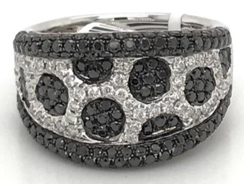 18KT WHITE GOLD ANNIVERSARY RING. 3D MULTI FLOWER DESIGN. WHITE DIAMONDS ARE F/G COLOR, VSSI CLARITY .40 CARATS. BLACK DIAMONDS ARE 1.35 CARATS. RING SIZE 7. CAN BE SIZED BY OUR MASTER JEWELER UPON REQUEST. WRITTEN APPRAISAL AVAILABLE. COMES IN A PRESENTABLE GIFT BOX.