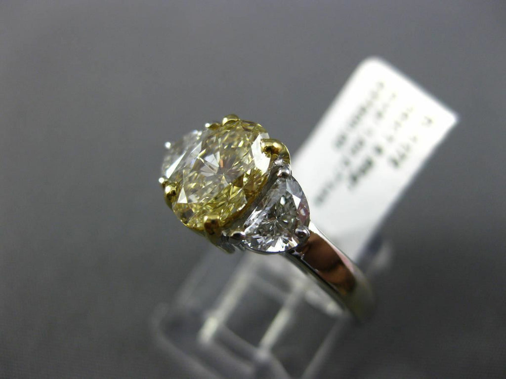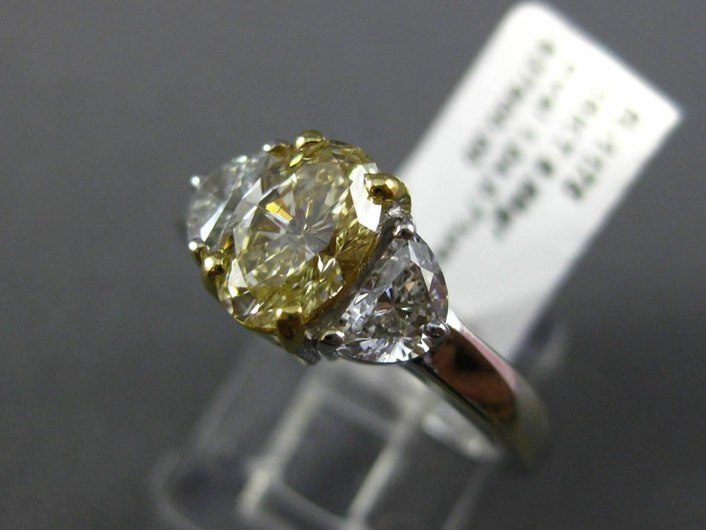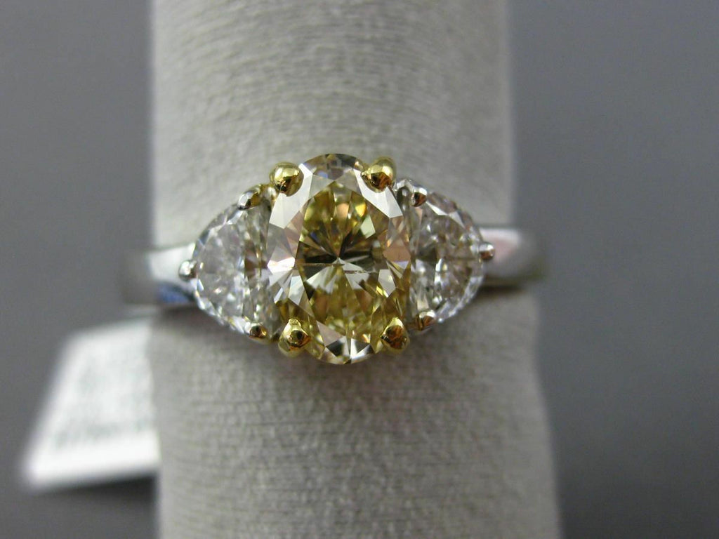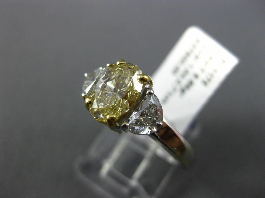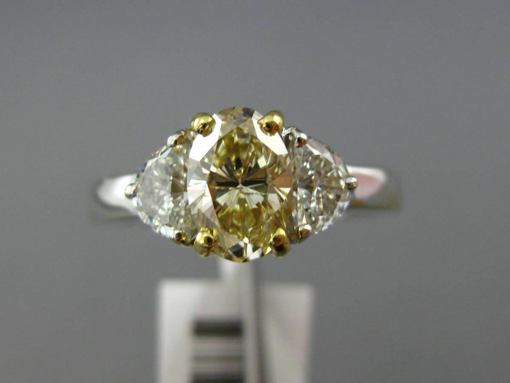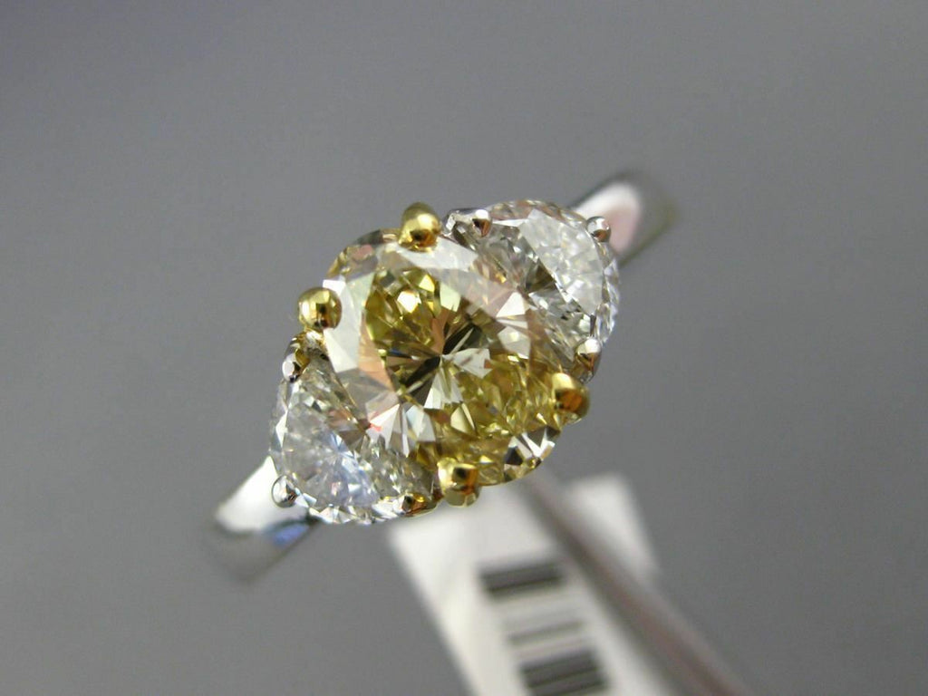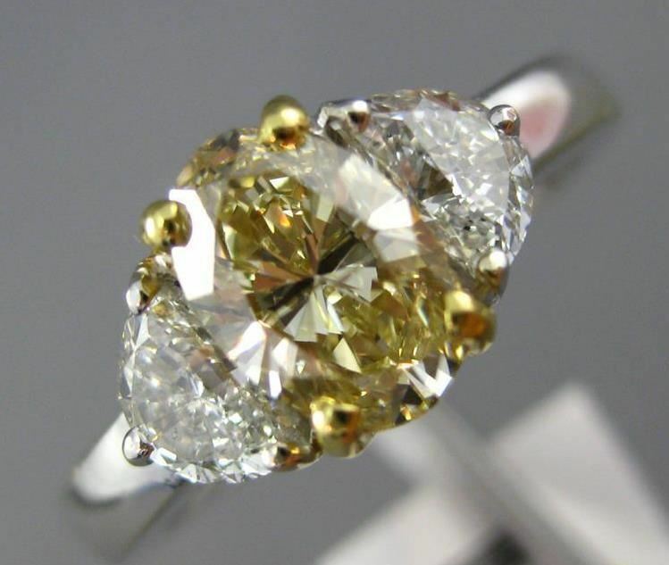 18KT WHITE & YELLOW GOLD ENGAGEMENT RING. 3D THREE STONE HALF MOON OVAL DESIGN. DIAMONDS ARE F/G COLOR, VSSI CLARITY .71 CARATS. FANCY YELLOW DIAMOND IS 1.04 CARATS. MEASURES 8mm WIDE. RING SIZE 7. CAN BE SIZED BY OUR MASTER JEWELER UPON REQUEST. WRITTEN APPRAISAL AVAILABLE. COMES IN A PRESENTABLE GIFT BOX.