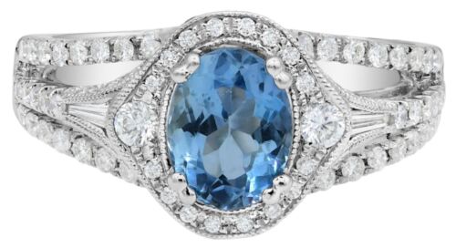 1.77CT DIAMOND & AAA AQUAMARINE 18K WHITE GOLD OVAL ROUND & BAGUETTE FLORAL RING