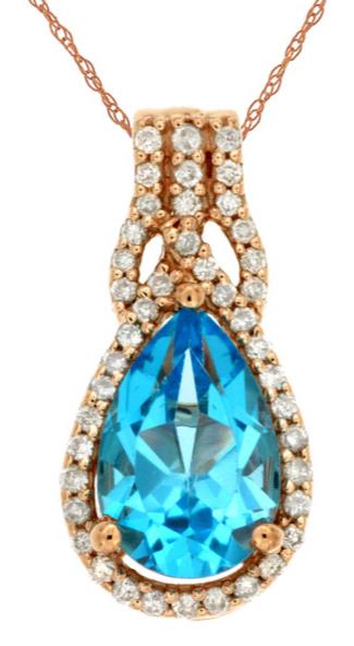 14KT ROSE GOLD FLOATING PENDANT. 3D HALO TEAR DROP DESIGN. ROUND DIAMONDS ARE F/G COLOR, VSSI CLARITY .18 CARATS. AAA EXTRA FACETED PEAR SHAPE BLUE TOPAZ IS 1.60 CARATS. COMES ON A 14KT GOLD DIAMOND CUT 18" INCH CHAIN. WRITTEN APPRAISAL AVAILABLE. COMES IN A PRESENTABLE GIFT BOX.