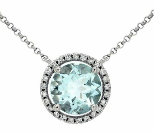 14KT WHITE GOLD PENDANT. 3D CLASSIC HALO SOLITAIRE DESIGN. ROUND DIAMONDS ARE F/G COLOR, VSSI CLARITY .14 CARATS. AAA EXTRA FACETED ROUND AQUAMARINE IS .14 CARATS. COMES ON A 14KT GOLD DIAMOND CUT 16" INCH CHAIN. WRITTEN APPRAISAL AVAILABLE. COMES IN A PRESENTABLE GIFT BOX.