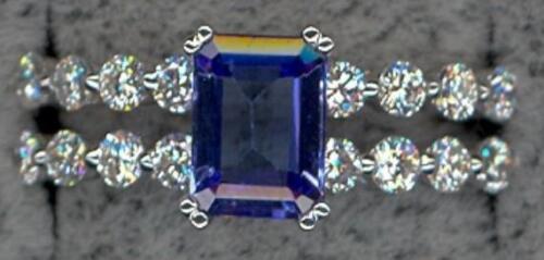 18KT WHITE GOLD ENGAGEMENT RING. 3D SHARED PRONG TWO ROW DESIGN. ROUND DIAMONDS ARE F/G COLOR, VSSI CLARITY .64 CARATS. AAA EMERALD CUT TANZANITE IS 1.16 CARATS. RING SIZE 7. CAN BE SIZED BY OUR MASTER JEWELER UPON REQUEST. WRITTEN APPRAISAL AVAILABLE. COMES IN A PRESENTABLE GIFT BOX.