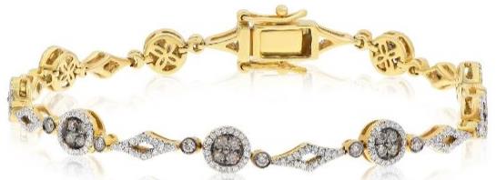 14KT YELLOW GOLD TENNIS BRACELET. 3D ROUND FLOWER HALO DESIGN. DIAMONDS ARE F/G COLOR, VSSI CLARITY .74 CARATS. CHOCOLATE FANCY DIAMONDS ARE 1.06 CARATS. 7" INCHES LONG. WRITTEN APPRAISAL AVAILABLE. COMES IN A PRESENTABLE GIFT BOX.