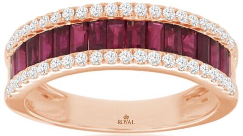 14KT ROSE GOLD ANNIVERSARY RING. 3D THREE ROW DESIGN. ROUND DIAMONDS ARE F/G COLOR, VSSI CLARITY .33 CARATS. AAA BAGUETTE RUBIES ARE 1.48 CARATS. RING SIZE 7. CAN BE SIZED BY OUR MASTER JEWELER UPON REQUEST. WRITTEN APPRAISAL AVAILABLE. COMES IN A PRESENTABLE GIFT BOX.