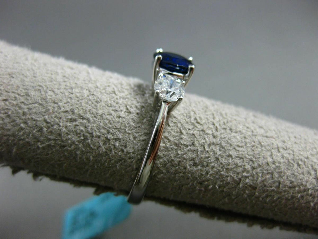 18KT WHITE GOLD ENGAGEMENT RING. 3D THREE STONE PAST PRESENT FUTURE DESIGN. DIAMONDS ARE F/G COLOR, VSSI CLARITY .55 CARATS. AAA SAPPHIRE ARE 1.26 CARATS. MEASURES 6mm WIDE. RING SIZE 7. CAN BE SIZED BY OUR MASTER JEWELER UPON REQUEST. WRITTEN APPRAISAL AVAILABLE. COMES IN A PRESENTABLE GIFT BOX.