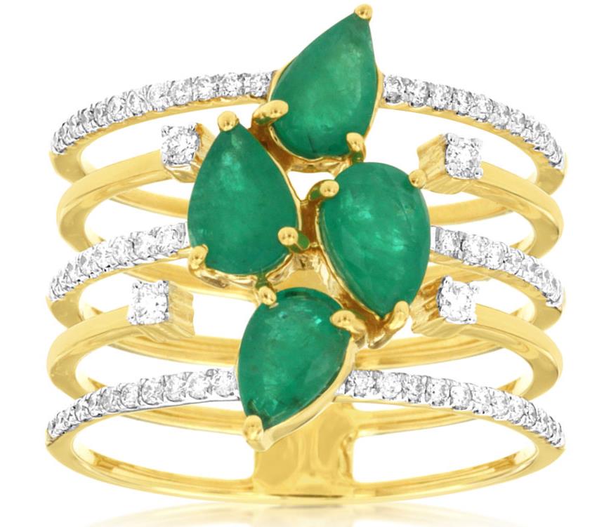 1.82CT DIAMOND & AAA EMERALD 14KT YELLOW GOLD PEAR SHAPE & ROUND MULTI ROW RING