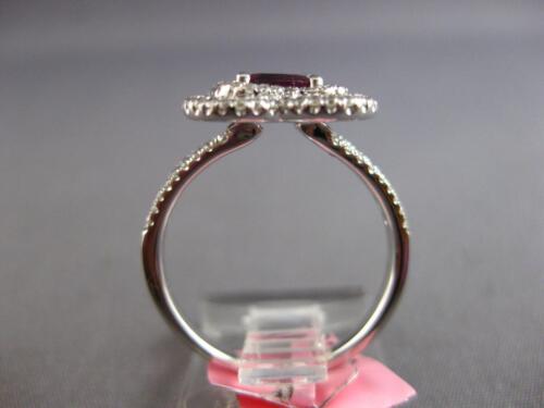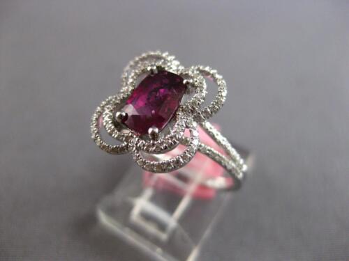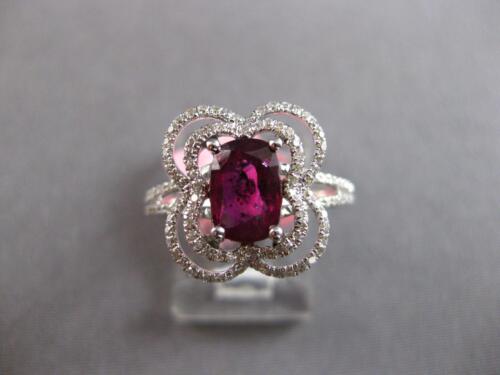 18KT WHITE GOLD LOVE RING. 3D FOUR LEAF CLOVER FLOWER DESIGN. ROUND DIAMONDS ARE F/G COLOR, VSSI CLARITY .40 CARATS. AAA OVAL RUBY IS 1.43 CARATS. MEASURES 14mm WIDE. RING SIZE 6.5. CAN BE SIZED BY OUR MASTER JEWELER UPON REQUEST. WRITTEN APPRAISAL AVAILABLE. COMES IN A PRESENTABLE GIFT BOX.