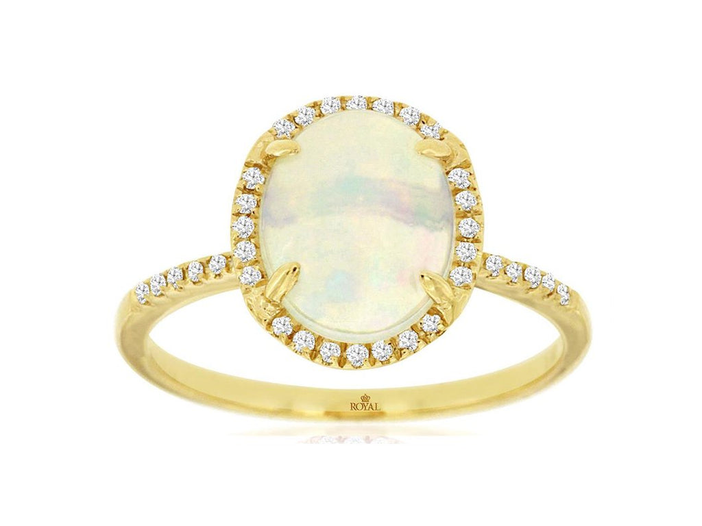 14KT YELLOW GOLD ENGAGEMENT RING. 3D HALO DESIGN. ROUND DIAMONDS ARE F/G COLOR, VSSI CLARITY .14 CARATS. AAA OVAL OPAL IS 1.70 CARATS. RING SIZE 7. CAN BE SIZED BY OUR MASTER JEWELER UPON REQUEST. WRITTEN APPRAISAL AVAILABLE. COMES IN A PRESENTABLE GIFT BOX.