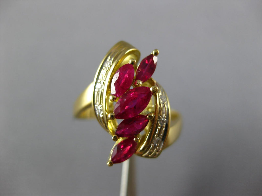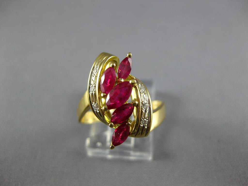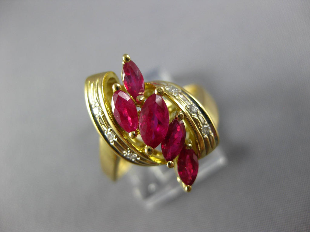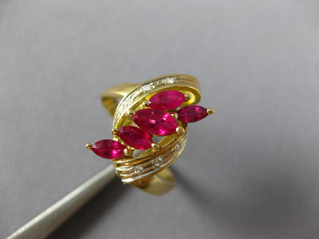 18KT YELLOW GOLD LOVE RING. 3D LEAF DESIGN. ROUND DIAMONDS ARE F/G COLOR, VVS/VS CLARITY .60 CARATS. AAA MARQUISE RUBIES ARE 1.25 CARATS. RING SIZE 8. CAN BE SIZED BY OUR MASTER JEWELER UPON REQUEST. WRITTEN APPRAISAL AVAILABLE. COMES IN A PRESENTABLE GIFT BOX.