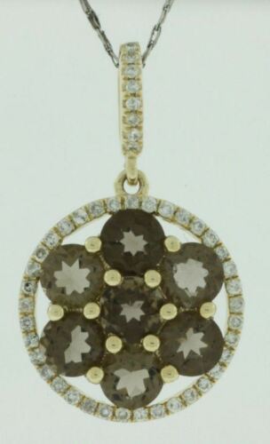 14KT YELLOW GOLD LOVE PENDANT. 3D FLOWER HALO CLASSIC DESIGN. DIAMONDS ARE F/G COLOR, VSSI CLARITY .16 CARATS. AAA SMOKY TOPAZ IS 1.70 CARATS. COMES ON A 14KT GOLD DIAMOND CUT 16" INCH CHAIN. WRITTEN APPRAISAL AVAILABLE. COMES IN A PRESENTABLE GIFT BOX.
