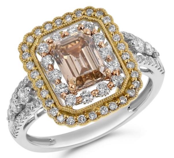 1.86CT WHITE & MOCHA DIAMOND 18K TRI COLOR GOLD EMERALD CUT HALO ENGAGEMENT RING