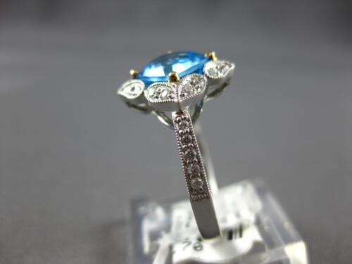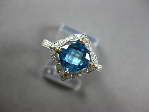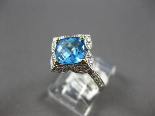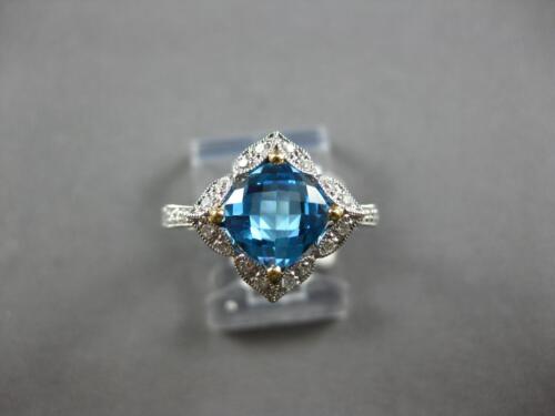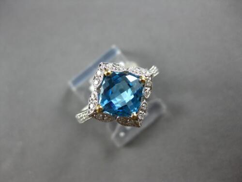 14KT WHITE AND YELLOW GOLD FUN RING. 3D FLOWER GEOMETRICAL DESIGN. ROUND DIAMONDS ARE F/G COLOR, VSSI CLARITY .18 CARATS. AAA EXTRA FACETED CUSHION CUT BLUE TOPAZ IS 1.7 CARATS. MEASURES 13.5mm WIDE. RING SIZE 6.75. CAN BE SIZED BY OUR JEWELER UPON REQUEST. WRITTEN APPRAISAL AVAILABLE. COMES IN A PRESENTABLE GIFT BOX.