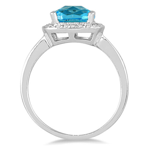 14KT WHITE GOLD FUN RING. 3D SQUARE HALO DESIGN. ROUND DIAMONDS ARE G/H COLOR, SI CLARITY .18 CARATS. AAA EXTRA FACETED CUSHION CUT BLUE TOPAZ IS 1.7 CARATS. RING SIZE 7. CAN BE SIZED BY OUR MASTER JEWELER UPON REQUEST. WRITTEN APPRAISAL AVAILABLE. COMES IN A PRESENTABLE GIFT BOX.