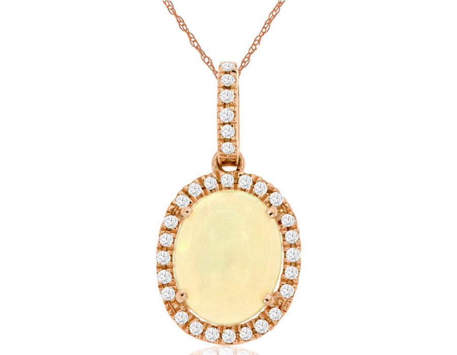 14KT ROSE GOLD FLOATING PENDANT. 3D CLASSIC HALO DESIGN. ROUND DIAMONDS ARE F/G COLOR, VSSI CLARITY .18 CARATS. AAA OVAL OPAL IS 1.70 CARATS. COMES ON A 14KT GOLD DIAMOND CUT 18" INCH CHAIN. WRITTEN APPRAISAL AVAILABLE. COMES IN A PRESENTABLE GIFT BOX.